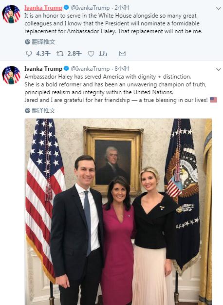 “很荣幸能和这么多优秀的同事一起在白宫工作,”伊万卡说,“我知道,总统将提名一位令人敬畏的黑莉大使的接班人,但那不会是我。”