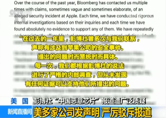 南加州大学跨国法律贸易中心主任 布莱恩·派克:基于苹果、亚马逊、超微三家公司的强烈否认,这篇文章是不准确的,信息来源也是错误的。我认为这很简单,事实是三家公司予以强烈否认。我认为这是(彭博社)记者们想要追踪报道一个大新闻,但是他们的报道基于错误的信息。