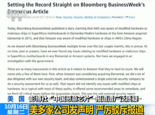 美国彭博商业周刊近日报道称,中国方面将一种微型芯片植入约30家公司的产品以获取秘密。然而包括苹果、亚马逊等文章所涉及的公司均迅速发表声明,明确否认公司产品遭受外界芯片植入,相关报道毫无根据。其中苹果公司还已经致信美国国会,再次声明公司从未发现有任何证据支持彭博社报道所提出的问题。