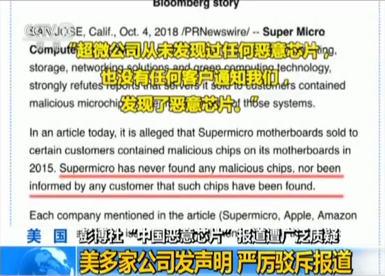 在彭博社的报道中,美国超微公司被指其在中国生产的主板被“植入黑客芯片”。对此超微公司同样否认了报道。超微公司在声明中强调,公司从未发现过任何恶意芯片,也没有任何客户通知我们发现了恶意芯片。公司所有产品都是经过多次日常安全审查,根本不存在彭博社所声称的问题,同苹果和亚马逊公司一样,超微公司从未被任何美国的执法部门调查。