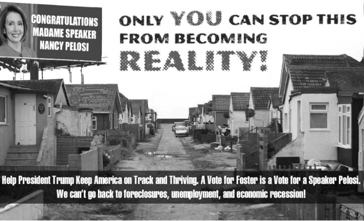 据美国有线电视新闻网(CNN)10月31日报道,伊利诺伊州共和党政客斯特拉近日在自己的脸书页面发布一张竞选海报(如图)。图片是一条坑坑洼洼的街道以及道路两旁破旧的平房,标语是“只有你们能阻止这些场景成为现实”。海报下方则写道,“帮助特朗普总统维持美国发展和繁荣。投票给福斯特就是投票给参议院民主党领袖佩洛西。我们不能再回到面临丧失抵押品赎回权、失业和经济衰退的时代!”据介绍,斯特拉下周在中期选举中的对手正是民主党在该选区的现任议员比尔·福斯特。