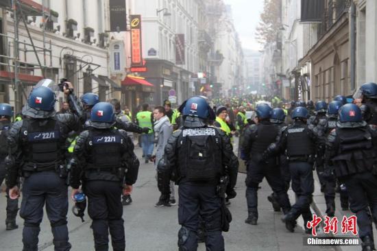 资料图:当地时间11月24日,巴黎香榭丽舍大街遭遇大规模示威活动。图为法国警方当天在香榭丽舍大街附近与大批示威者对峙。中新社记者 李洋 摄