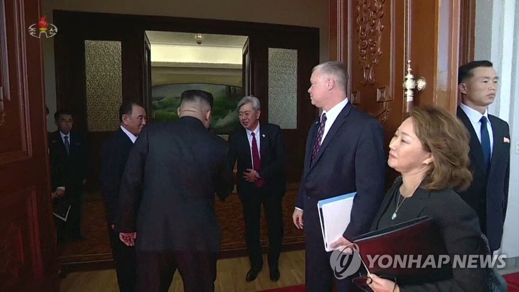 资料图:10月8日,在朝鲜,金正恩与安德鲁·金握手。(图片:韩联社)