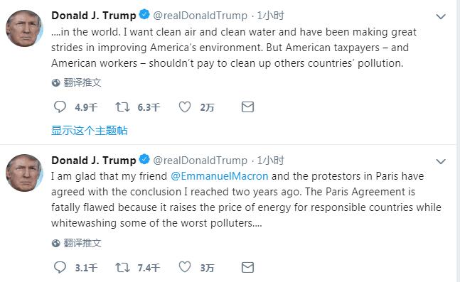 【环球网报道 记者 朱梦颖】“我很高兴我的朋友马克龙和巴黎的抗议者同意我2年前的结论。”在法国总理菲利普4日宣布暂停上调燃油税后,特朗普连发2条推特,开始蹭热点、自夸起来。