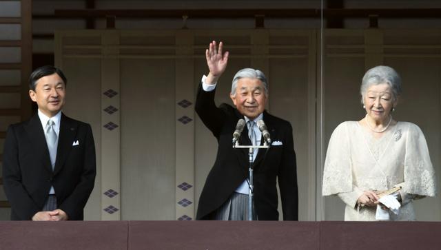 日本明仁天皇(中)接受普通民众朝贺,德仁皇太子(左)和皇后陪伴(新华网)
