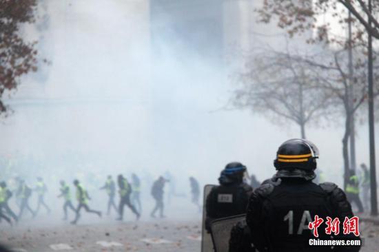 当地时间12月1日,巴黎再次发生大规模示威活动。示威者聚集在凯旋门。巴黎警方向示威者施放催泪瓦斯,试图将示威者驱散。中新社记者 李洋 摄