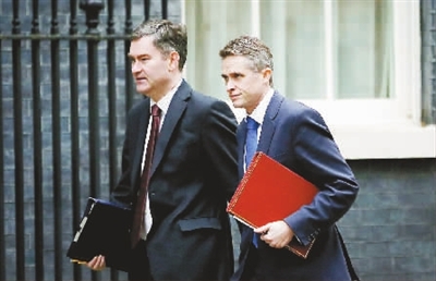 12月18日,在英国伦敦,英国国防大臣加文·威廉姆森(右)、英国司法大臣戴维·高克抵达唐宁街参加内阁会议。新华社发 (蒂姆·爱尔兰 摄)