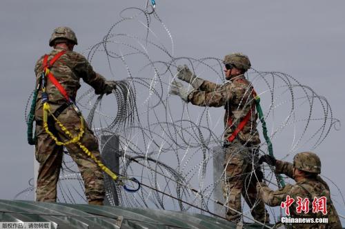 当地时间11月2日,美国得州Hidalgo,中美洲移民大军压境美国,美国士兵在美墨边境安装铁丝网严防移民入境。