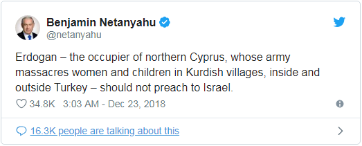 在土耳其发出以上声明前,以色列总理本雅明⋅内塔尼亚胡在社交平台上抨击了埃尔多安,称他是“北塞浦路斯的占领者”,指责其军队在土耳其以外的库尔德村庄“屠杀妇女和儿童”,并坚称埃尔多安“不应向以色列说教”。