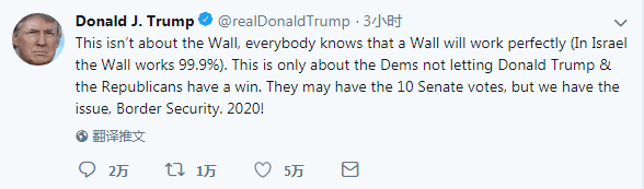 他写道:“这与墙无关,每个人都知道一堵墙将会完美地发挥作用(以色列的隔离墙能99.9%发挥作用)。这只是民主党人不让唐纳德·特朗普和共和党人取得胜利。他们可能举行了10次参议院投票,但我们存在边境安全的问题。2020!”