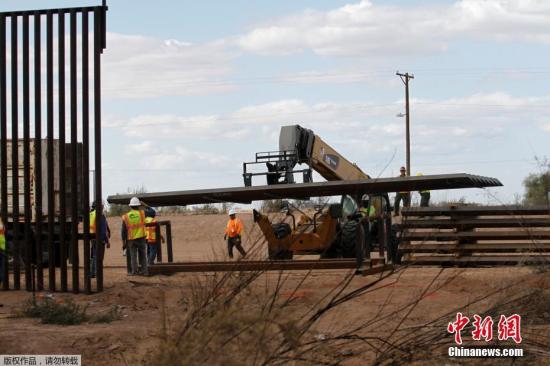 资料图:当地时间2018年2月22日,美国海关和边境保护局对一段边境隔离墙进行更换。