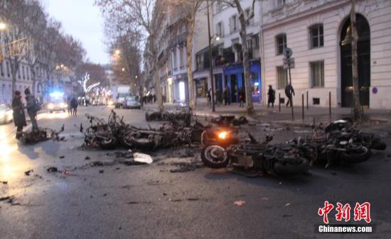 当地时间1月5日,法国2019年首轮示威,数以千计民众走上街头抗议,巴黎市中心陷入混乱,有多辆摩托车在示威期间被烧毁。中新社记者 李洋 摄
