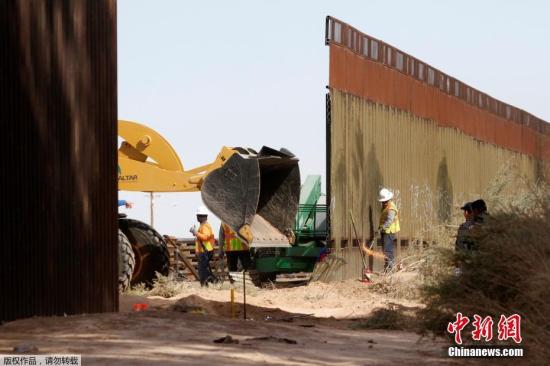 当地时间2018年2月22日,美国加州卡莱克西科附近,美国海关和边境保护局对当地一段边境隔离墙进行更换。这标志着美国联邦政府启动了美国与墨西哥边境隔离墙的修建工程。