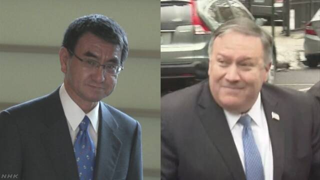 资料图:日本外相河野太郎与美国国务卿蓬佩奥(NHK电视台)