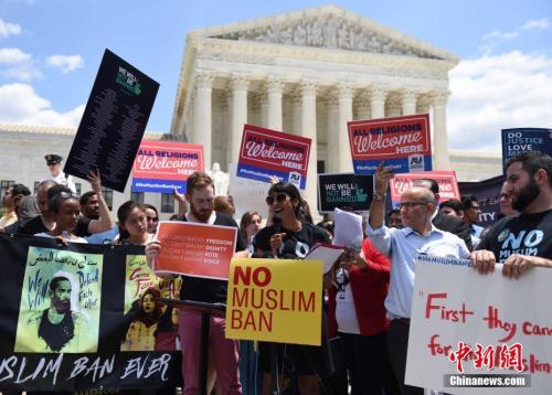 在美国联邦最高法院裁决支持特朗普2017年颁布的移民限制令后,民众在最高法院门口抗议。中新社记者 邓敏 摄