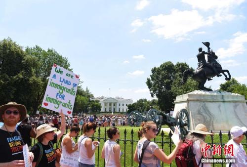 当地时间2018年6月30日,数千名美国民众聚集在白宫外举行示威活动,抗议特朗普政府强制实行“零容忍”政策,迫使众多非法入境者家庭“骨肉分离”。中新社记者 刁海洋 摄