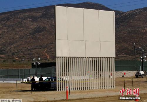当地时间2017年10月12日,墨西哥提华纳,从美墨边境墨西哥一侧拍摄到的边境墙样品。特朗普2017年1月25日签署行政命令,宣布在美墨边境线上筑墙,以阻挡非法移民和犯罪人员越境从事非法活动。