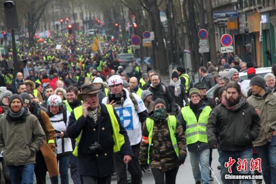 当地时间1月19日,巴黎遭遇自2018年11月以来的第十轮示威。图为示威游行队伍当天穿过巴黎市中心。中新社记者 李洋 摄