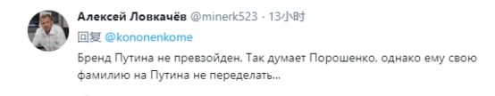 还有一网友评论道,“普京的品牌从未被超越。所以波罗申科这么想,但他不能改名为普京……”