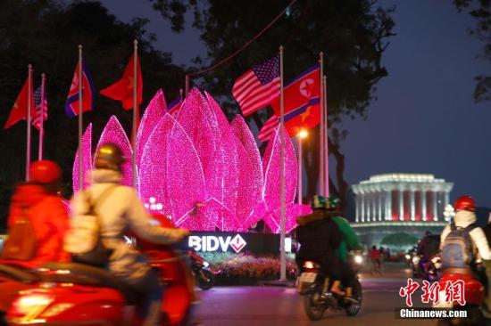 2月25日,越南首都河内街头悬挂的越南、美国、朝鲜三国国旗。朝鲜最高领导人金正恩与美国总统特朗普27日至28日将在越南首都河内举行第二次会晤。中新社记者 富田 摄