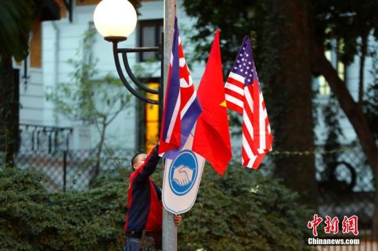 资料图:当地时间2月25日,越南首都河内,工作人员正在街头安装越南、美国、朝鲜三国国旗。中新社记者 富田 摄