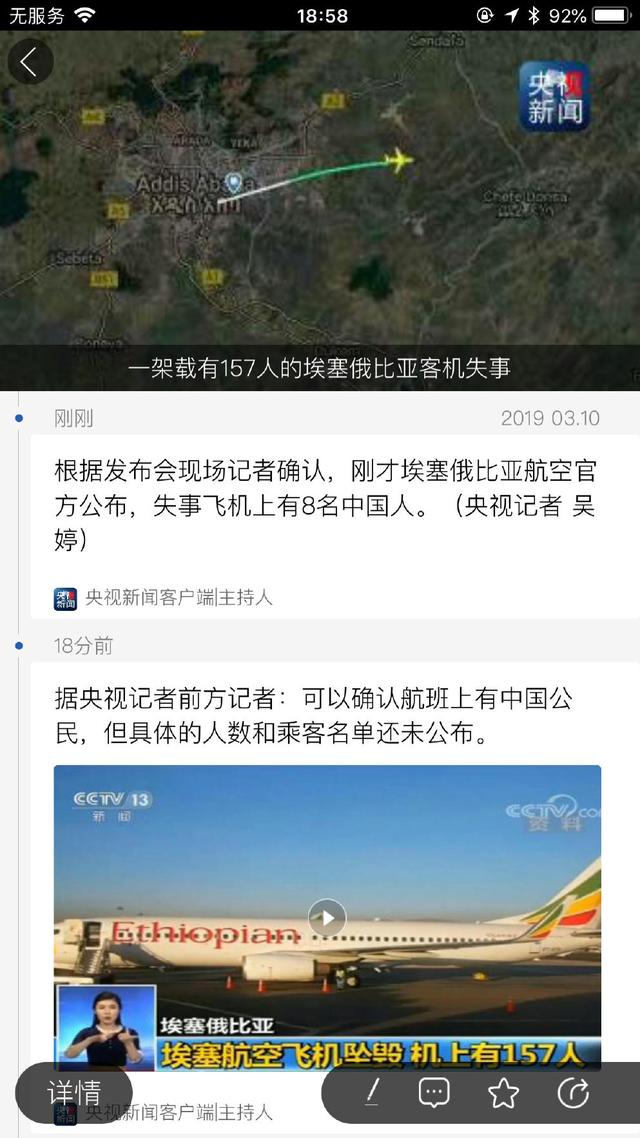 载有149名乘客与8名机组人员的埃塞俄比亚航空ET302号航班当地时间10日早晨从亚的斯亚贝巴飞往内罗毕途中坠毁。埃航新闻发言人称,飞机乘客来自33个国家,事故中没有生还者。据央视新闻报道,遇难者中有8中国籍乘客。