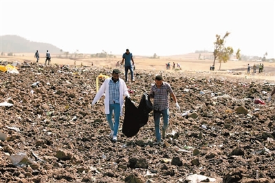3月10日,在埃塞俄比亚首都亚的斯亚贝巴附近,救援人员在坠机现场工作。新华社发(迈克尔·特韦尔德 摄)