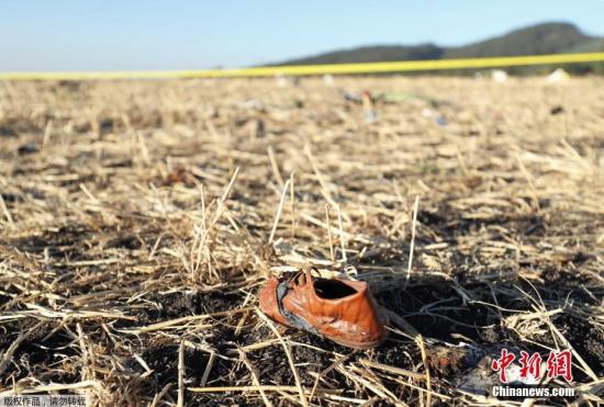 图为埃航飞机失事现场,散落在地上的一只鞋子。