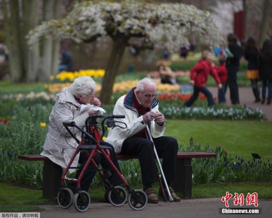 资料图:荷兰阿姆斯特丹,一对老夫妻看完花卉展在长椅上共进午餐。