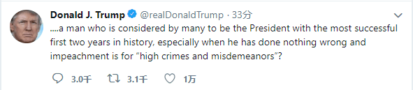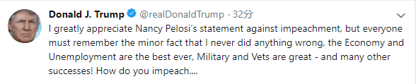 特朗普13日在其推特上写道,“我非常感谢南希•佩洛西反对弹劾总统的声明。每个人都必须记住一个小事实——我从未做错任何事。美国的经济和就业率达到有史以来最好成绩,军队和兽医都很好,还有许多其他的成功!你怎么能弹劾这样的总统……一个上任两年就被许多人认为是历史上最成功的总统,尤其是他没有做错什么,弹劾是因为“重罪和轻罪”吗?”
