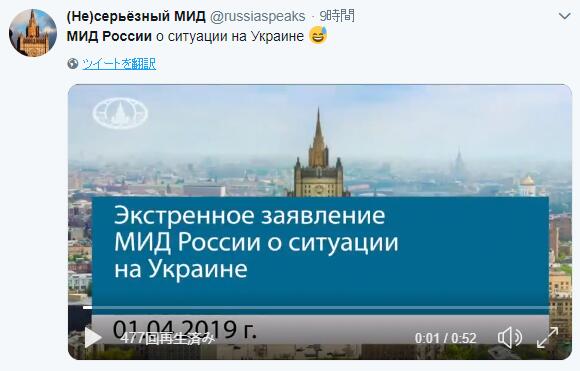 据《俄罗斯报》4月1日报道,俄罗斯外交部当天在推特上发布了一则关于乌克兰局势的“紧急声明”视频。视频开头写道,“2019年4月1日,俄罗斯外交部关于乌克兰局势的紧急声明。鉴于4月1日的形势,因为(民众)有对乌克兰局势发表评论的频繁要求,决定发布该视频:由于乌方不允许俄罗斯观察员出现在投票现场,相关视频资料是根据客观监测设备的数据做出来的。基辅4月1日气温零上9度,哈尔科夫零上14度,敖德萨零上14度。总的来说,一切都很清楚”。