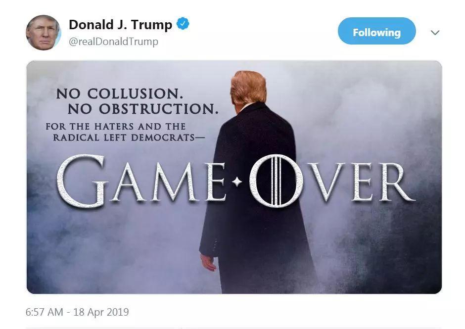 他先是发布了一个全长54秒的视频,截取了他在各个场合重复宣称“没有勾结”的镜头,足足强调了10遍;随后,又发布了一张《权力的游戏》风格的海报,宣布“游戏结束了”。