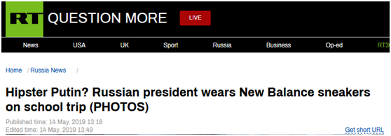 RT说,普京当天穿了一双美国潮鞋品牌新百伦(New Balance)的运动鞋。当时,他正在参观一所名叫“天狼星教育中心”的天才儿童学校,听取有关其运作情况和进一步的发展计划的汇报。当天晚上,他还参加了一场冰球联盟表演赛。