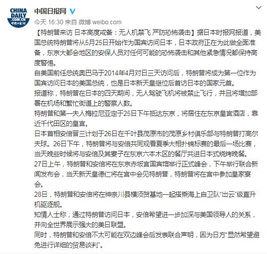 报道称,特朗普在日本的四天期间,无人驾驶飞机将被禁止飞行,并且将增加部署在机场和繁忙街道上的警察人数。