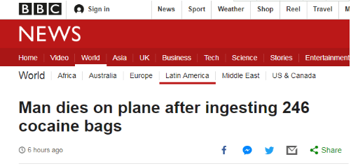 【环球网报道 记者 朱梦颖】据英国广播公司(BBC)报道,当地时间26日,一名日本男子因藏了246袋可卡因在体内导致脑水肿,在一架由墨西哥城飞往日本东京成田机场的客机上死亡,客机紧急备降墨西哥索诺拉州。