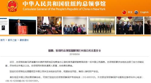 中新网6月4日电 据中国驻美国纽约总领馆网站消息,近日,一名中国公民在美国遇害。驻纽约总领馆特此提醒领区中国公民注意安全。