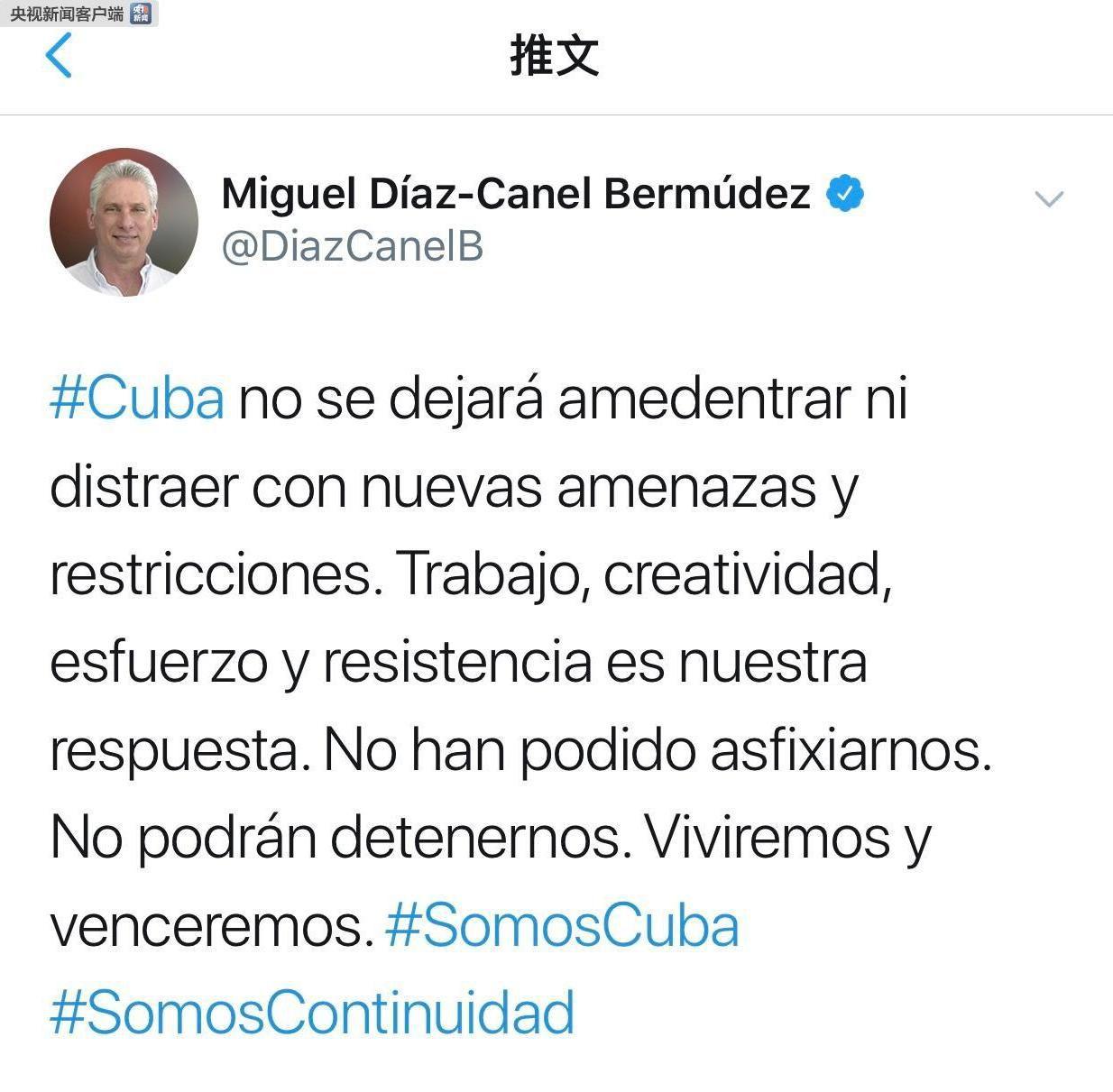 迪亚斯-卡内尔表示,古巴不会被新的威胁和限制措施吓倒和分心,古巴人民将继续努力工作、创新发展、奋发向上和顽强抵抗。新制裁无法阻挡古巴前进的步伐,古巴人民将赢得胜利。