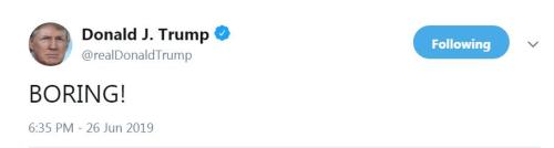 特朗普对民主党首场辩论的“观后感”只有一个单词:无聊!(图片来源:社交网站截图)