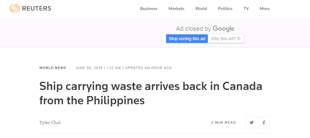 根据此前媒体报道,2013年到2014年间,一家加拿大公司向菲律宾出口了103个装有据称是“可回收塑料”的集装箱,其中34箱已经被处理。但经菲律宾海关检查,另外的69个集装箱中有大量电子产品垃圾、厨房垃圾等。菲律宾指责加拿大违反《巴塞尔公约》,向菲律宾出口和转移危险废料,并一再敦促加拿大运回这批垃圾。