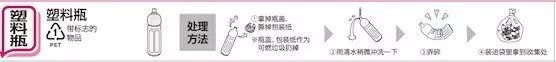 如图所示:第一步,拿掉瓶盖,撕掉包装纸,瓶盖和包装纸要作为可燃垃圾扔掉;第二步,用清水稍微冲洗一下瓶子;第三步,压扁瓶子;第四步,装进袋子里拿到垃圾收集处。