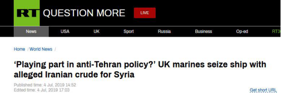 由于目前美国正施压伊朗以将后者石油出口降至零,“今日俄罗斯”(RT)4日反问:英国也加入“反德黑兰政策”?伊朗方面已抗议英国“非法劫持油轮”。