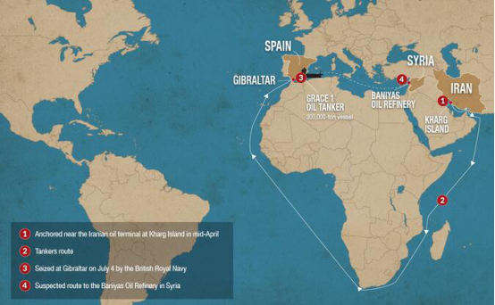 直布罗陀属于英国的海外领土,位于伊比利亚半岛南端。据RT报道,直布罗陀首席大臣皮卡尔多(Fabian Picardo)4日介绍说,这艘油轮悬挂着巴拿马国旗,为一家新加坡公司所有,(被扣时)正在前往叙利亚巴尼亚斯(Banyas)炼油厂的路上。皮卡尔多解释,“该炼油厂是受欧盟对叙利亚制裁影响的实体财产。”