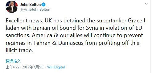 当地时间4日,美国国家安全顾问博尔顿在推特上将英国扣押油轮称作“好消息”。他称,美国及其盟友将继续阻止德黑兰与大马士革政权从这种“非法贸易”中获利。