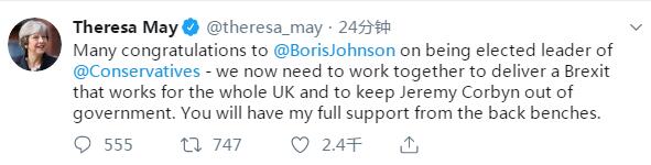 几乎在同一时间,特雷莎·梅也通过社交平台推特向约翰逊送出祝福,“我们将一起努力实现脱欧,让杰里米·科尔宾离开政府,你将在后座议员席得到我全面的支持。”