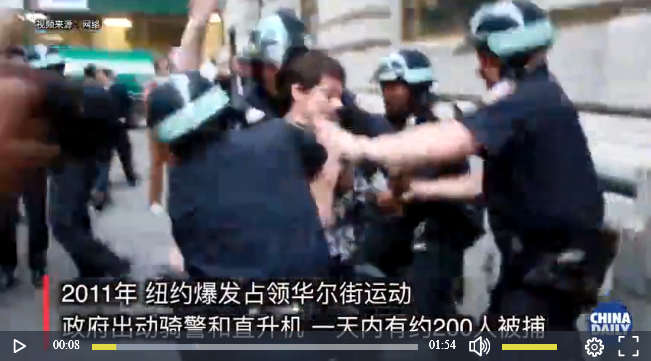 2011年9月,美国纽约爆发了“占领华尔街”运动, 上万名民众在华尔街金融区安营扎寨,以表达对美国财富分配不公的不满。后来这场运动扩散到了美国全境。2011年11月15日凌晨,纽约警方展开突击行动,“武装到牙齿”的防暴警察进入抗议者的大本营祖科蒂公园,将他们驱散或抓走。