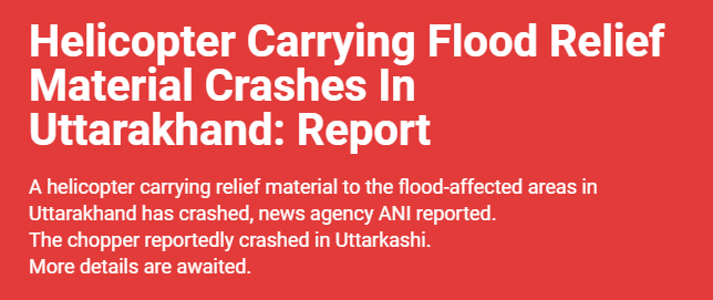 海外网8月21日电 据新德里电视台报道,印度一架直升机在北阿坎德邦坠毁,机上载有洪水救援物资。