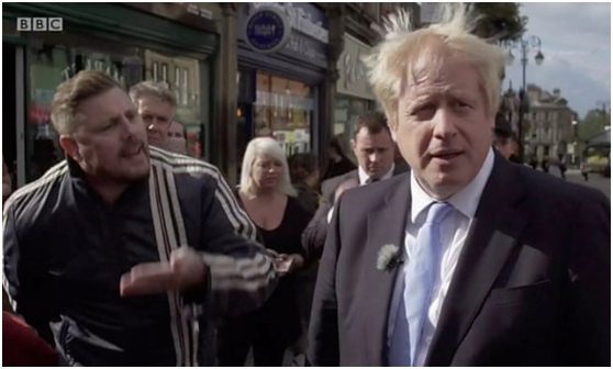 在一段由英国广播公司(BBC)拍摄的视频中,一位面带微笑的路人一边与约翰逊握手,一边礼貌地说:“请离开我的小镇”。没带停顿,约翰逊回复说:“我会的,很快。”