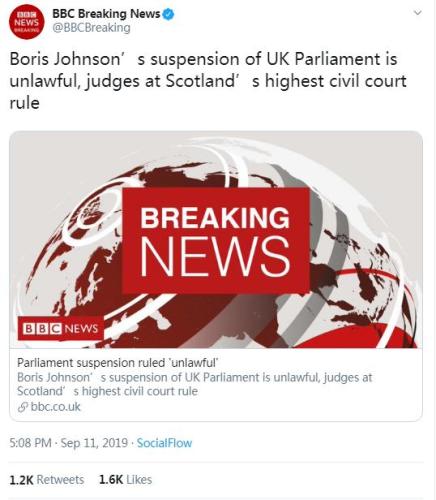 9月6日,英国高等法院驳回反对暂停议会的请求,裁定约翰逊要求议会休会不违法。此前,也曾有多名议员提请苏格兰法院禁止首相关闭议会,也遭驳回。