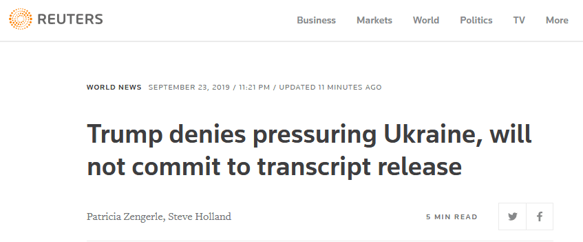 【环球网报道 记者 王博雅琪】“不,我没有。”乌克兰版“选举门”持续发酵之际,继21日公开斥责这一消息为“假新闻”,特朗普23日再次否认施压乌克兰总统泽连斯基调查拜登之子。至于民主党人就此要求“弹劾”特朗普一事,路透社23日报道说,特朗普当天稍早时候表示,并没有把“弹劾”当回事儿。