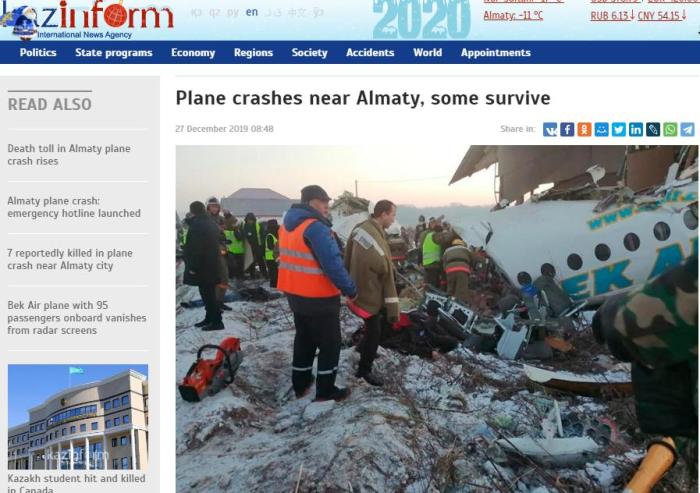 消息称,Bek Air航空公司执飞阿拉木图至努尔苏丹的Z2100次航班12月27日在起飞阶段于7时22分(北京时间9时22分)坠落,冲破混凝土围栏并撞入一栋2层楼建筑。